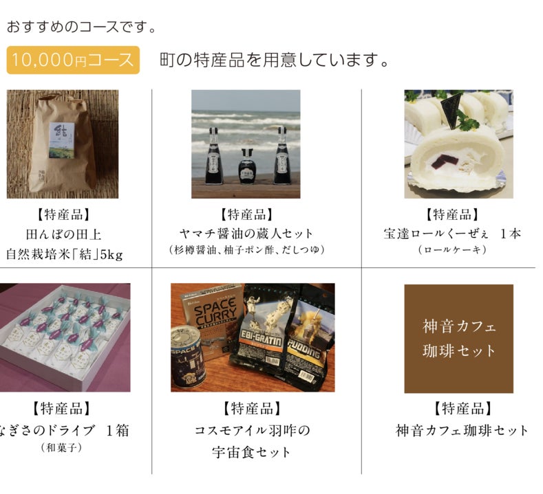 田んぼの田上 自然栽培米「結」や、創業1919年のヤマチ醤油、洋菓子店と石川テレビが共同開発した宝達ロールくーぜぇ、なぎさドライブ、コスモアイル羽咋の宇宙食セット、神音カフェの珈琲セットなど、地元の特産品をご用意しております。また、宿泊プランや、ポストカード、ポスタープランなどあります。