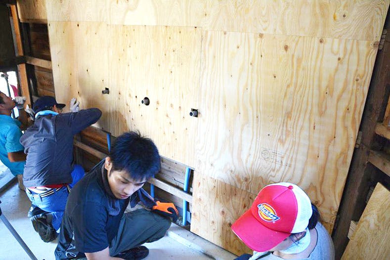 本題の壁板ハリ。水道やコンセントが顔を出せるように穴を開けながらはっていきます。真四角の板を貼ろうとすると、柱と隙間ができる。なんでかなーと思って確認すると、柱が斜めに傾いていました!あらま!一枚目の壁板を水平垂直にはり、それに合わせて順番にはっていく作戦で、着々と作業が進んでいきました。