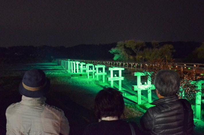しまだ大井川マラソンのコースでもある「蓬莱橋」(ほうらいばし)です。ギネスにも認定されています。夜には島田のシティプロモーションである”緑茶”色にライトアップされます。
