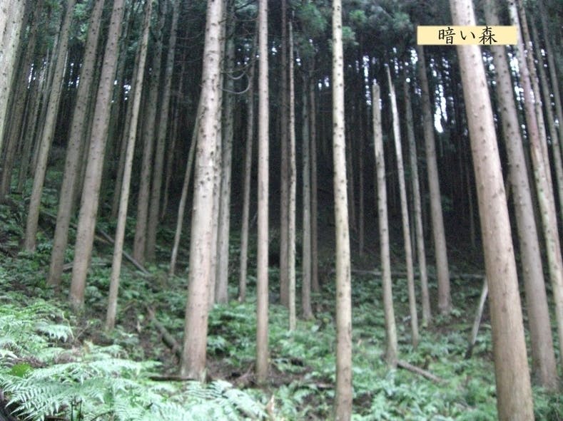 普段 遠目に見る森は、緑が生い茂り健全に見えるかもしれません。でも、一歩中へ入ると、木が木材として使われないため、密集した真っ暗な森が増えています。手入れがされず、草や低木が生えず、災害の原因になったりもします。森と人との距離が離れてしまっている状態です。