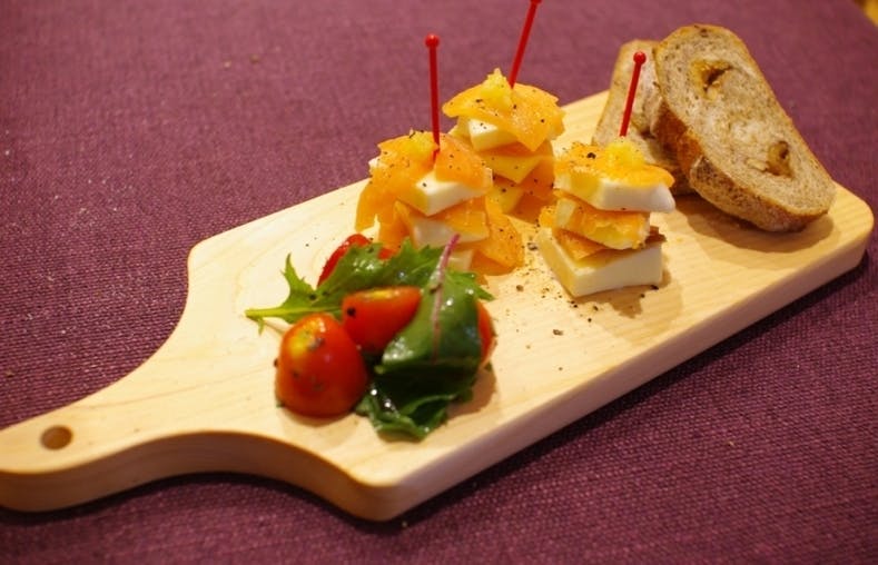 クーポンチケットの他、京都丹州で育ったヒノキで作られた、オリジナルのグルメプレートをご用意しています。お料理を載せるだけで、食卓がオシャレに。ピクニックにも活躍します。[サイズ 板面 21cm(持ち手込みで30cm)×11.5cm×厚み1.7cm]