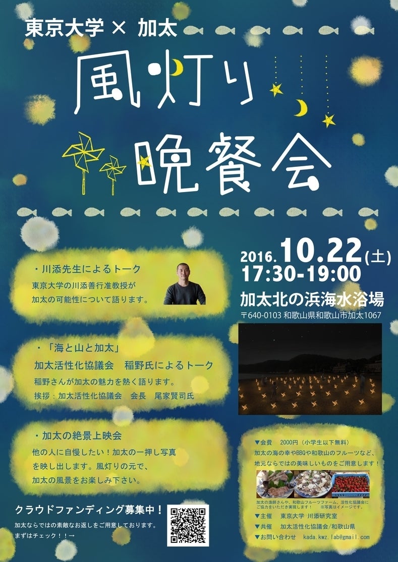 2016/11/01 22:42おかげさまで、たくさんのご支援をいただき、加太の海辺に風灯りを灯すことができました!晩餐会はあいにくの雨となりましたが、加太の美味しい食べ物や和歌山のフルーツ、楽しいお話で盛り上がりました! ワークショップは23日は見事に晴れ、加太の夕日と風灯りの美しいコラボが実現しました!風が吹くと、パタパタと音を立てて風車が回り一斉に灯りがともる姿は圧巻でした。皆様、本当にどうもありがとうございました!風灯りワークショップはおかげさまで、たくさんの新聞やテレビなどメディアに取り上げていただきました!お返しについて、一部10月以内としておりましたが現在ようやく準備が整い、11月上旬には皆様のお手元に届けします。後不憫おかけして申し訳ございません。今後とも、引き続き加太と、川添研究室を応援していただけると幸いです。 もっと見る目標達成!と、風灯り晩餐会のお知らせ