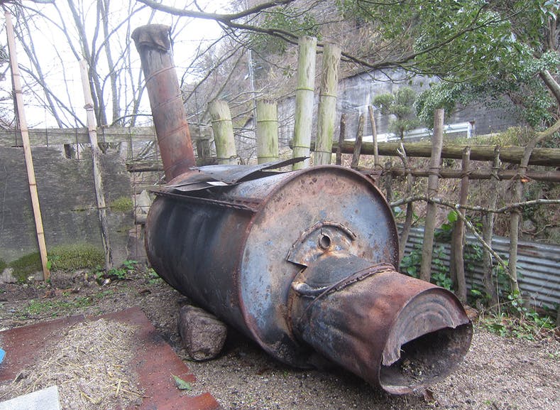 雨の中ですが、まだ小雨なので、古い炭焼き窯を新たな設置場所へ移動です。