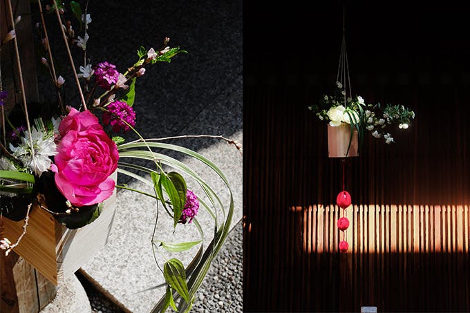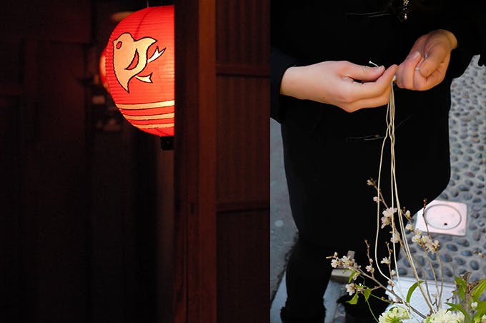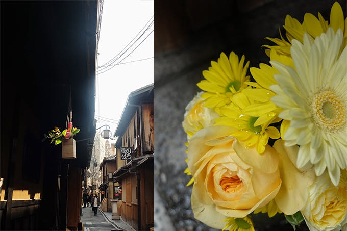 通りに張り出していた看板がなくなってライトが少し暗くなると、そこにはちゃんと、昔からの先斗町の景色が残っていました。それらに目を向けてもらえれば、先斗町の町並みをもっと楽しんでもらえるのではないか。私たちは、花を置いてみることにしました。