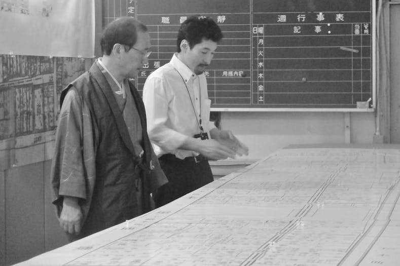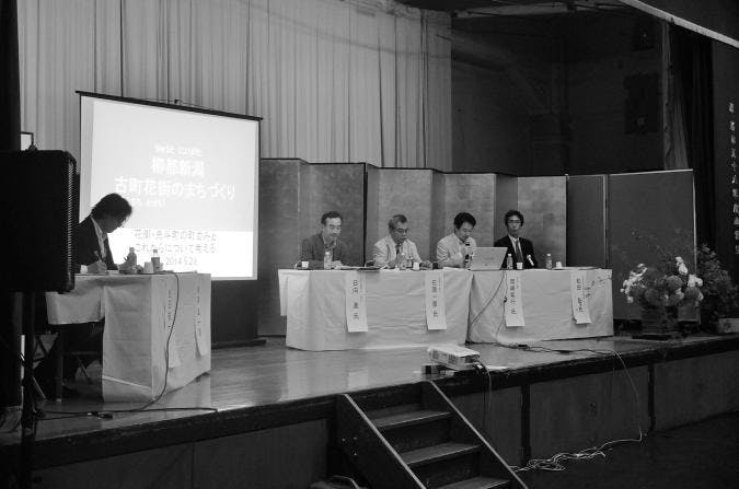 地元・立誠自治連合会が立ち上がりました。2009年、「先斗町の将来を考える集い」として地元の有志が集まりました。その後立誠自治連合会会長の下、世話人として先斗町お茶屋組合の取締役・楠大毅、料理屋さん・食べ物屋さんの組合である先斗町のれん会の副会長・金田祐一、そして自治連合会副会長の神戸啓の3名を副会長に据え、「先斗町まちづくり協議会」が誕生しました。