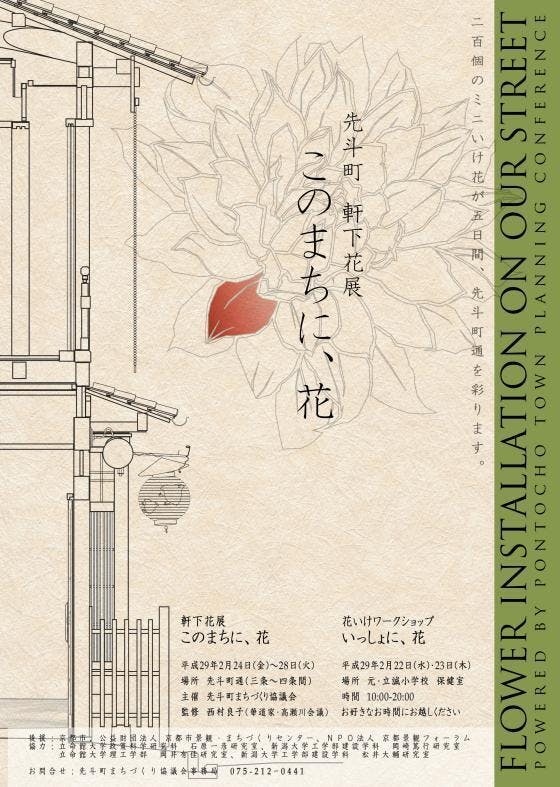 今年もぜひ先斗町の軒先を、お花で彩りたいと思います。みなさまの暖かいご支援を、心からお待ちしております。並びにご都合よろしければ、ぜひとも花いけワークショップにてお花をいけに来ていただき、同時に”花を通して見る先斗町の町並み・景色”をお楽しみいただければと思います。