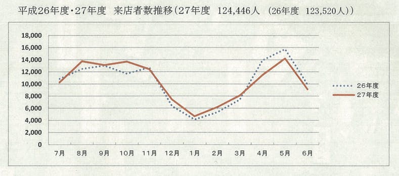 平成26年度・27年度の来店者数推移を見ると、平成26年度の123,520人に比べて、平成27年度は124,446人と、ほぼ横並びとなっていることがわかります。