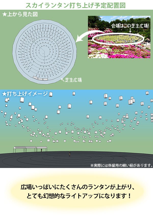 このプロジェクトでは、通常のスカイランタンイベントとは異なり、予めランタンとウエイト(重り)を糸で繋げておくことで、空中で留まるようにしています。これによって、公園内の小道を歩きながら、様々な方向からつつじとスカイランタンのコラボレーションをを楽しんでいただけます!