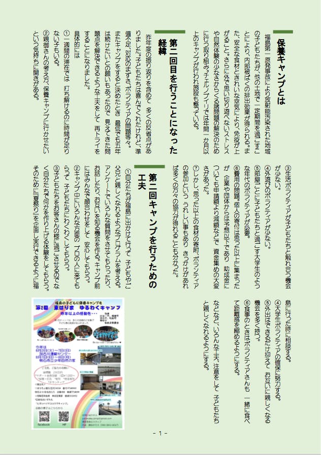 ③子ども達をお客さんのように過ごさせるのではなく自分たちで何かを作り上げる体験をしてもらう。そのために『夏祭り』を企画し実行できるように福島に行った時に相談する。