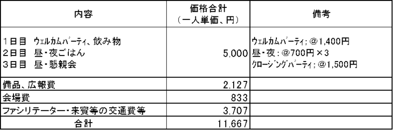 高校生・大学生一人当たりの参加費を4,000円にするため、原価11,667円との差額7,667円を補てんしたいです。
