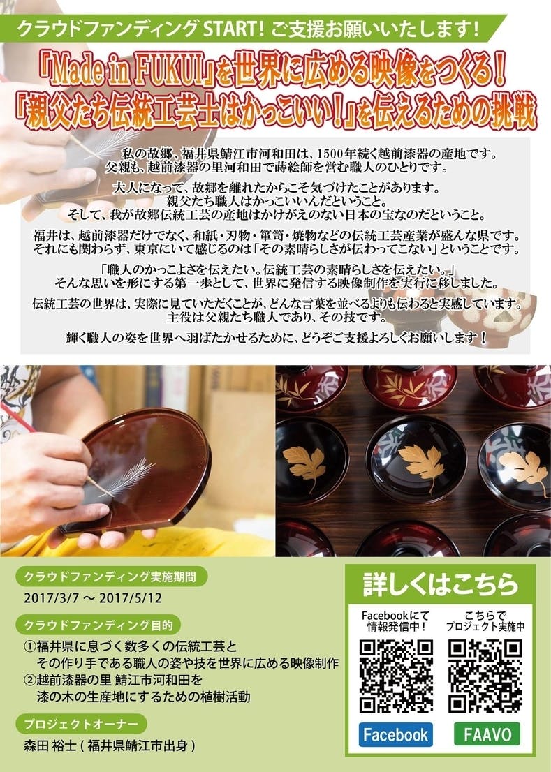主役はそんな福井が誇る数多くの伝統工芸の職人さんであり、その技です。 輝く職人の姿を世界へ羽ばたかせたい!