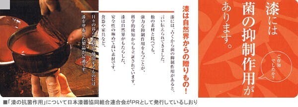 また漆を塗ったプレートを入れた生理食塩水と、単なる生理食塩水の両方に菌液(O-157など)を入れると、1日後に前者は完全に菌がなくなり、後者は大量の菌が残っていたという結果も出ています。