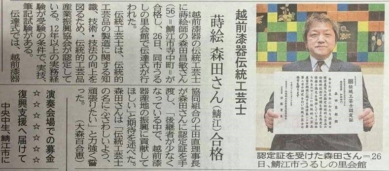 つい最近、父親も正式に越前漆器伝統工芸士に認定されました。
