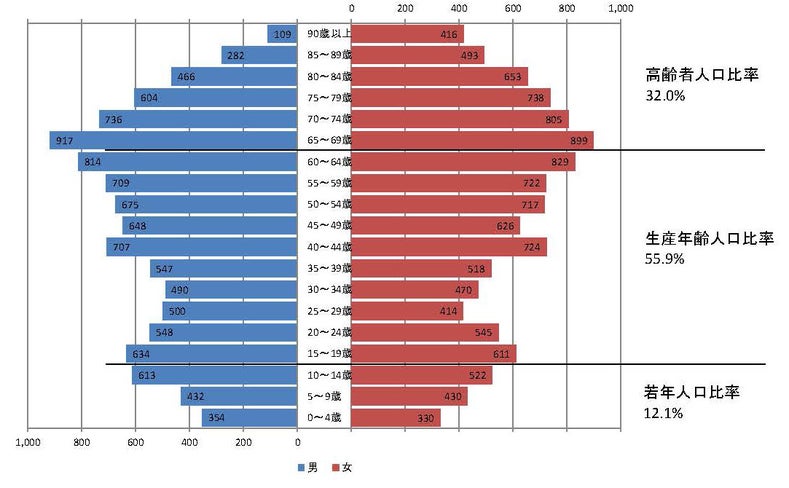 住民基本台帳によると、2015年4月時点で、総人口に占める65歳以上の割合である高齢化率は32.0%(兵庫県平均26.3%)、0歳から14歳までの若年人口比率は12.1%となっています。今後さらに高齢化率が増加し、若年人口比率は減少していくことが予測されています。