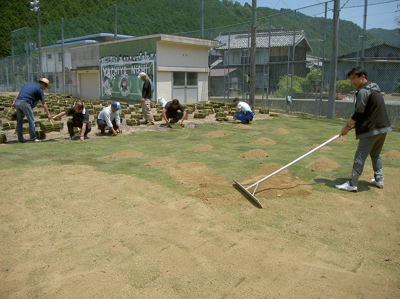 • グラウンドゴルフ場全面に芝生を貼り付ける作業は、県の緑化事業の補助金を活用させていただく事になり、CHIIPROメンバーが手作業で貼り付けをしていくため、広い校庭を二分割して芝生を貼り付ける「第一期工事」を三月初旬より取り掛かりました。 専門家にお越しいただき、芝生の貼り付け方、水やり等の管理方法のレクチャーを受け、作業に取り掛かります。 なにぶん初めての作業で、1枚目のシートを置く時には手が震えましたが徐々に作業に慣れて行き、流れ作業の息もピッタリと合うように!さすが、地域のプロフェッショナルが揃うCHIIPROメンバー。いい感じで作業が進んでいきます。 第二期工事は、梅雨入り前の6月中旬よりスタート。暑い夏が来るまでに芝生の根がしっかりと張るようにと、この時期に貼り付けを開始しましたが、想定外の空梅雨!生育状況が心配でしたが、見事な緑の絨毯へと成長してくれました。 予想以上にたくましく育つ芝生に、暑い中の作業も報われます。 青々と育つ芝生を前に、次の段取りへと進みます。グラウンドゴルフ場としての、芝刈りの作業です。 乗り込んで作業をするタイプの芝刈り機を導入。しかし誰も乗った事のない代物でしたので、急遽運転講習会を実施!遠慮がちに運転する人から、大胆な操作でダイナミックに刈り込む人までと、それぞれの特徴を垣間見た講習会となりましたが、最後には理想に近い刈り方を見出すことが出来ました。 こうして初夏を迎える頃には全面緑化が完了し、緑の映えるグラウンドゴルフ場となりました。 認定コースのグラウンドゴルフ場として、より快適にプレー出来るように今後も整備を続けていきます。そしてプレー以外でも充実した空間であり続けるために、校舎側の改良も進めていく予定です。その第一弾が、今回の「家庭科室」を「憩いの部屋」にするリフォーム計画です。プレーの合間のひとときだけでなく、コミュニティー空間としてもご活用いただきたいと思いで事業を進めて行きますので、応援のほどよろしくお願い致します。   もっと見る