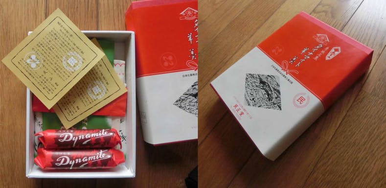 工場の近くには、株式会社民正堂という和菓子屋さんがあり、そこで販売されていた和菓子に「ダイナマイト羊羹」がありました。