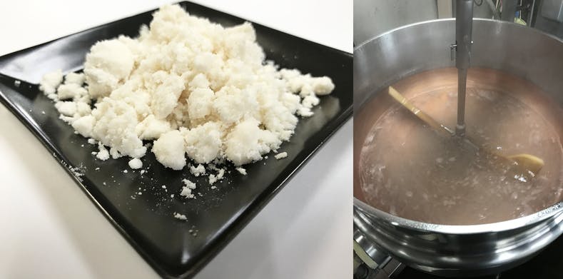 ▲現在開発中の商品(左:生白あん 右:羊羹製造過程)