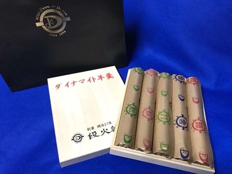 包装紙のデザインもダイナマイトの雰囲気を持たせ、明治時代のダイナマイトは木箱に入っていたことから3~5本のダイナマイト羊羹を木箱に入れて販売したいと考えています。