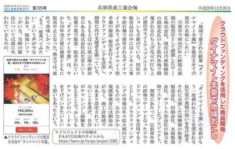 2018/01/06 16:21あけましておめでとうございます! プロジェクトも残すところ2週間を切りました! ダイナマイト羊羹のサンプル開発が少し遅れ気味ですが、頑張って完成させたいと思います。 話は変わりますが、私が所属している商工会という全国各地にある団体でセミナーを受けたのが、今回のクラウドファンディングをやってみようと思ったきっかけなのですが、その兵庫県版の会報にダイナマイト羊羹プロジェクトを取り上げて頂きました! こうやって、自分の取り組みを色んな方に見ていただけるというのは、有難いですね。 沢山の方に応援、支援を戴いておりますので、何よりもダイナマイト羊羹を完成させないといけません! ダイナマイト羊羹を食べたい!欲しい!と思っていただける様なところまで作りこまないと、支援を戴くことは出来ませんので、何よりも羊羹サンプルを作りこみます。 現在のところ、白餡の風味を生かした松、梅、桜、塩の各種類が出来上がっております。 あと1種類、悩みに悩んでおりますが、近日中に試食レポートを作成したいと思います。 最終最後まで、宜しくお願い致します。 もっと見る