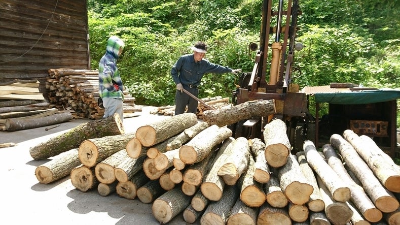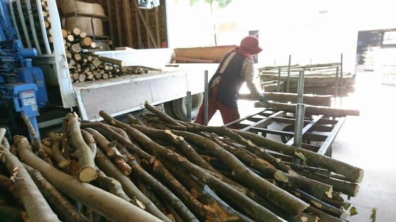 細い木は、太さや樹種によって分けて台車に乗せます。