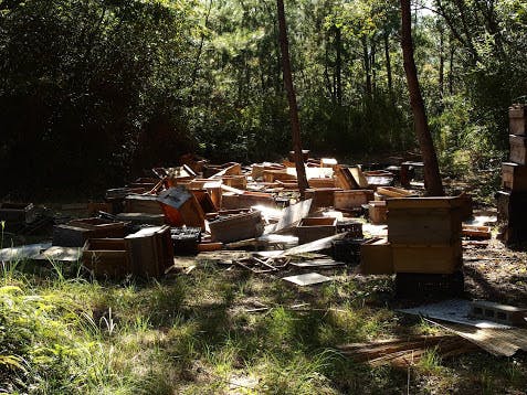 いつもと同じように養蜂場の様子を見に行った日のこと、森の道を進み蜂場が開けて見え始めましたが、整然と並んでいたはずの巣箱が視界にありません。
