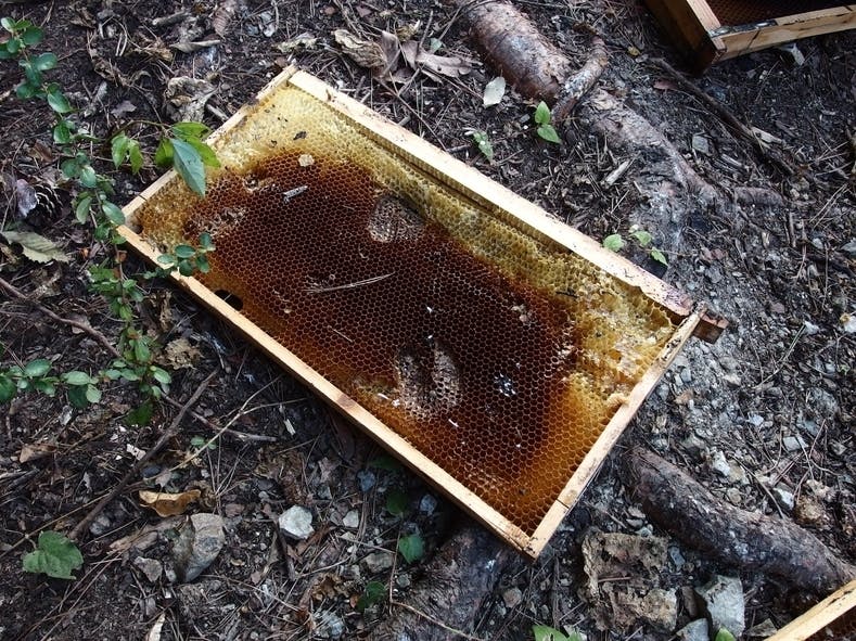 どうも事故的にか学習の上でか、寒い中で巣箱を倒して、刺されないように蜂が凍えて動けなくなっている隙に食べたのではないか・・・