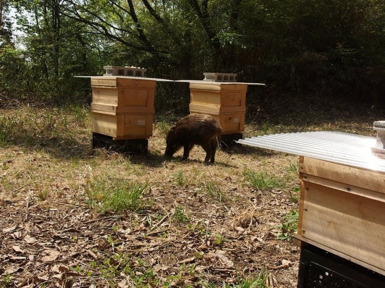 もともとイノシシの多い地域で、他の2箇所の養蜂場も含め、普段からすぐ傍にイノシシが歩いているのが日常です。アライグマも多くいます。