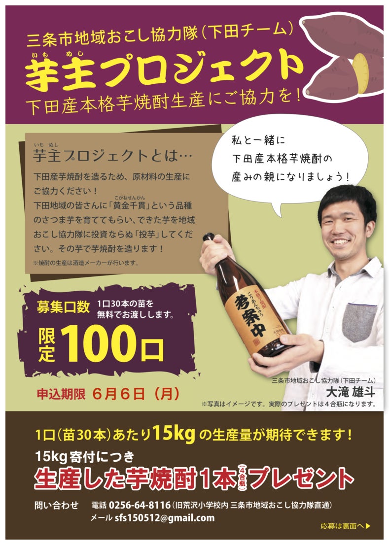 そこで5月に「芋主プロジェクト」として黄金千貫の生産協力者を下田地域限定で募集しました。黄金千貫の生産に協力してくれた方には、その生産量に応じて完成した焼酎をプレゼント(焼酎1本/芋15kg)するというものです。結果的に下田内のサツマイモ初心者さんからプロのサツマイモ農家さんまで幅広い方々のご協力が得られました。