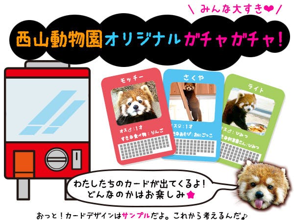 • 皆さま、こんにちは!西山動物園の伊藤です。 昨年のクラウドファンディングでお約束していたカードガチャガチャのこと覚えていますか? 大変長らくお待たせしました。レッサーパンダカードガチャガチャが完成しました。 遅くなりましたこと深くお詫び申し上げます。 10月28日(日)から販売開始です。 ガチャガチャの設置場所は「レッサーパンダの家」のラウンジです。 価格は1回200円です。1箱に2枚入っています。そしておまけ付きです。 カードの種類は全部で10種類! 西山動物園にお越しの際はぜひ試してみて全種類を集めてください。 併せて「レッサーパンダのいえ」の屋外展示場のウッドデッキにベンチを設置しました。 これからはゆっくり腰掛ながらレッサーパンダを見てくださいね! もっと見る