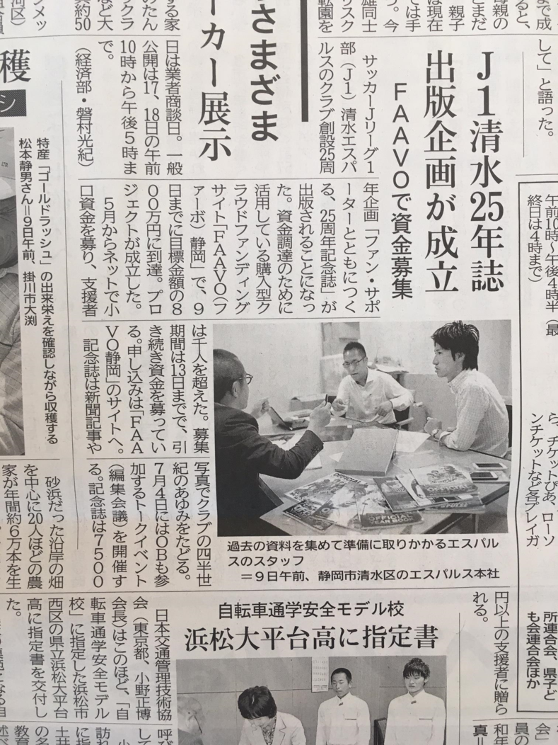 この度は、清水エスパルスのクラブ創設25周年企画『ファン・サポーターとともにつくる、清水エスパルス25周年記念誌』プロジェクトにご協力いただき、誠にありがとうございます。 本日(6/10)の静岡新聞朝刊に、準備に取り掛かる様子の記事が掲載されました。 静岡新聞朝刊(掲載日:2017年6月10日) 記事に取り上げてくださった静岡新聞社の皆様、ありがとうございます。 記念誌発刊へ向けて、しっかりと準備を進めてまいります。 ===== 本日は、本プロジェクトにご参加いただいた皆様へ記念誌に関する重要なご案内がございます。 今一度、記念誌に掲載されるご芳名の確認をお願い申し上げます。 記念誌のご芳名は、基本的に「FAAVO公開名」での掲載となります。 FAAVO公開名とは、プロジェクトのサイト内の「応援コメント」ページに表示されているお名前です。 また、ニックネーム等のFAAVO公開名ではなく、記念誌には本名等をご希望の場合は、「備考欄」にご希望の掲載名をご記入いただいております。 ご自身の公開名を忘れてしまった、もしくは公開名を変更したい、備考欄を追記したい方は、下記をご確認の上、確認・修正をお願いします。 なお、公開名の修正や備考欄の追記は、本プロジェクト募集期間内の【6月13日(火)23:59:59まで】しかできませんので、ご注意ください。 ご賛同いただいた多くの皆様とともにつくる『25周年記念誌』。 何年後、何十年後と後々に残る書籍であり、次の世代に残す“バトン”となります。 ご自身の名を“クラブの歴史に刻む”ということで、お間違えが無いよう再度ご確認いただければ幸いです。 【公開名 修正方法】 ※公開名=「応援コメント」に表示されるお名前=記念誌掲載名 ①「FAAVO」TOPページの右上にあるログインをクリック ②FAAVO登録した際の情報を入れて、ログインする ③「アカウント情報を編集する」をクリック ④公開名を修正 ⑤「更新する」をクリック ⑥「プロフィール情報を更新しました」コメントが出れば、完了。 【備考欄 修正方法】 ※公開名ではない、記念誌への掲載名をご希望の場合のみご記入ください。 ①「FAAVO」TOPページの右上にあるログインをクリック ②FAAVO登録した際の情報を入れて、ログインする ③右上の丸型に表示されているプロフィールアイコンをクリック ④開いたメニューの「支援情報の確認・変更」をクリック ⑤支援履歴の「清水エスパルス25周年記念誌」の一番下「支援情報を編集する」をクリック ⑥備考欄を修正 ⑦「更新する」をクリック ⑧「発送先情報を更新しました」コメントが出れば、完了 下記は操作画面もついた詳細説明です http://faavo.jp/magazine/8110