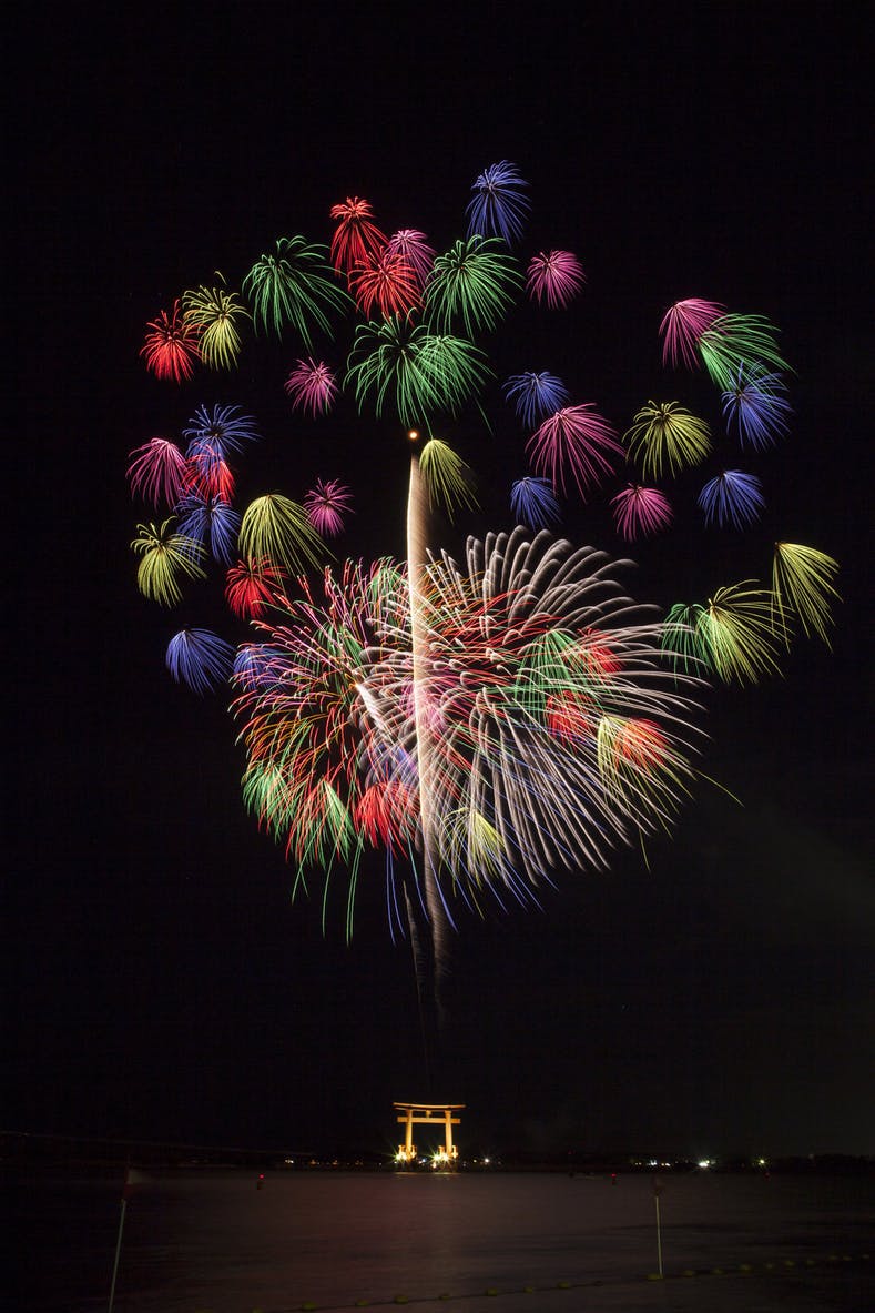 ▲弁天島の鳥居と海をバックに夜空を彩ります(2016年8月 花火大会の様子)