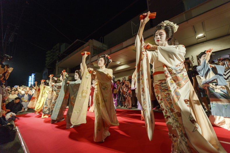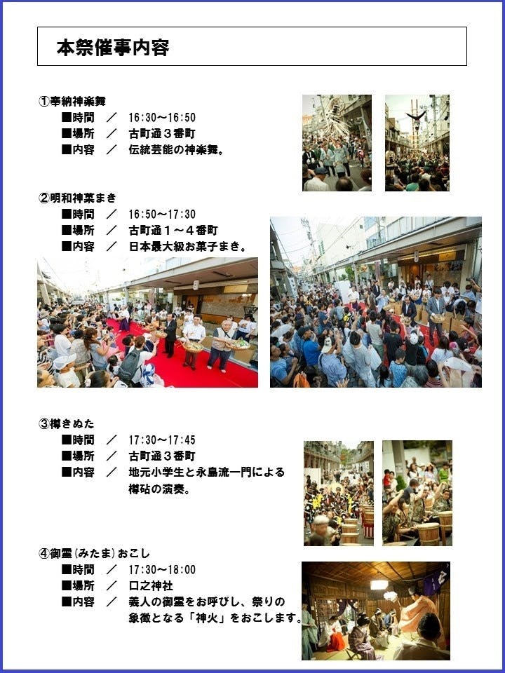 明和義人を祀る愛宕神社境内社の口之神社に加えて、商店街を歩行者天国として、子ども遊びや縁日・屋台、古町芸妓の舞、蜑(あま)の手振り【奉納盆踊り】など一般の方々も楽しめる様々な行事を開催しております。また、日本最大級の「神菓まき(お菓子まき)」も人気のプログラムです。