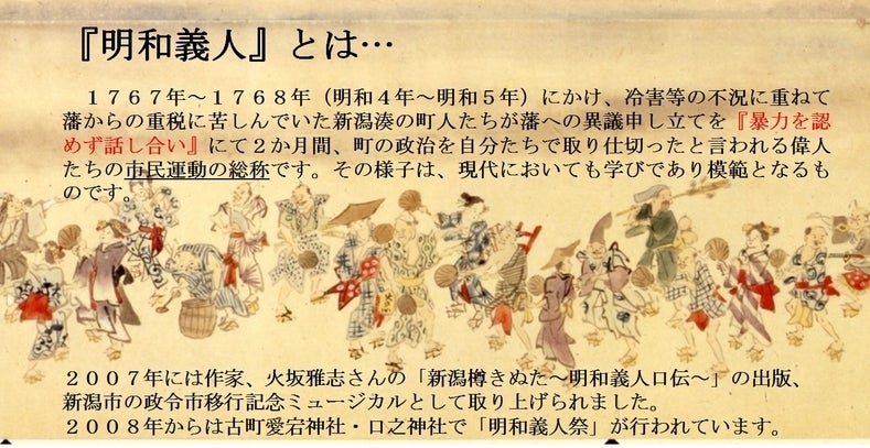 皆さんは「明和騒動(1768)」をご存知でしょうか?それは、フランス革命よりも前に、湊まち新潟で町人たちの手によって起こされた市民運動でした。力で解決せず、対話でまちの政治を変える。その時代、町人が奉行所や藩に意見をするなど、考えられないことでした。