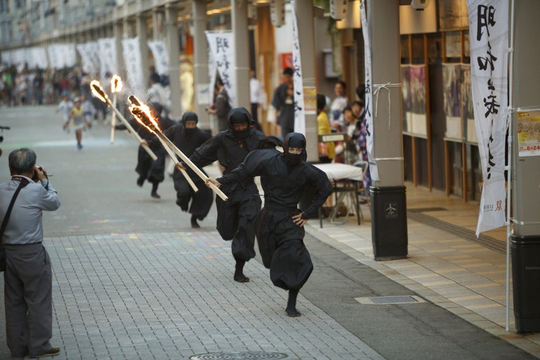 ※【黒装束分火】夕暮れ時に開催され、幻想的な光景です。