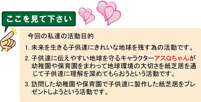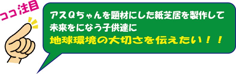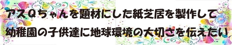 今回クラウドファンディングを利用しようと思った理由は、子供達に親しみやすいキャラクター「アスQちゃん」を主人公にした地球環境を考える紙芝居を製作して、アスQちゃんととも幼稚園、保育園、イベントにもっと参加したいと考えたからです。