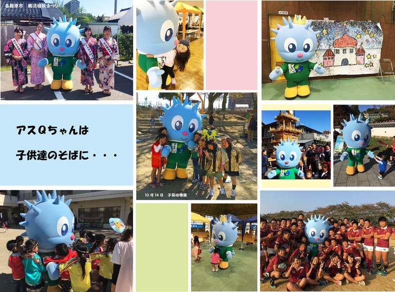現在は、アスQちゃんというキャラクターの着ぐるみを自費で製作して、イベントや幼稚園に訪問し、アスQちゃんのテーマソング「きれいな地球がいいね♪♪」を歌ったりして子供達と触れ合っています。