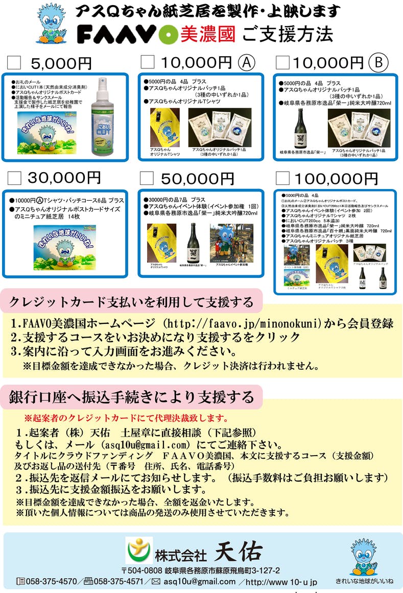 アスQちゃんのオリジナルのTシャツやバッチや各務原名産のお酒や映像で見ていただいた紙芝居のミニチュア紙芝居を返礼品としてお送りします。