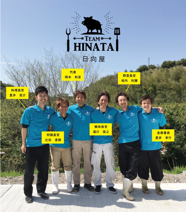 ▲左から更井亮介(料理長官)、辻田直樹(狩猟長官)、岡本和宜(代表)、湯川俊之(解体長官)、垣内利彌(野菜長官)、更井考行(金庫番長)