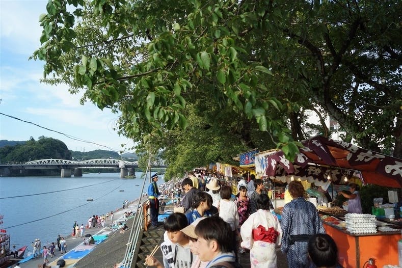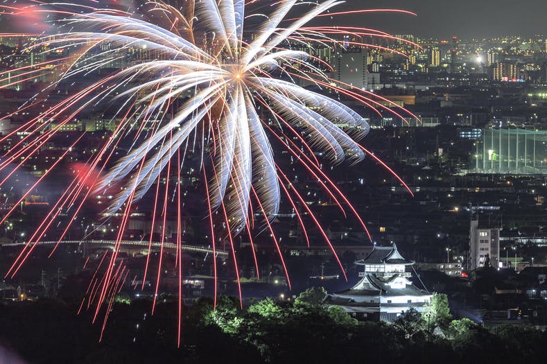 愛知県犬山市と岐阜県各務原市の間を流れる木曽川で行われ、船から打ち上げられる花火は風情たっぷりです。また、数々の花火がライトアップされた国宝犬山城を背景に打ち上げられます。