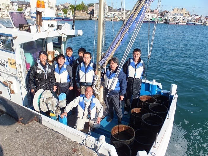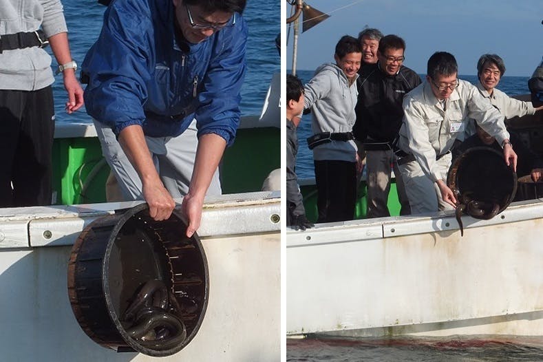 ▲遠州灘で親うなぎを放流するメンバーたち[2015年11月]