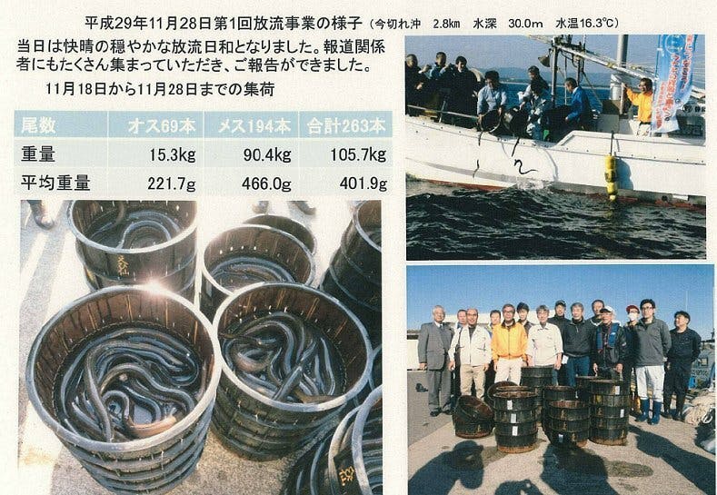 2018/02/27 16:52浜名湖発「ニホンウナギ資源回復プロジェクト」に多くの応援とご支援をいただき感謝いたします。 平成30年2月25日の日本養殖新聞に掲載いただきましたので転載してお伝えいたします。 昨年のウナギ放流量 前年比58%減の173.7kg 浜松うなぎ販売組合や浜名湖養魚漁業協同組合などで組織される浜名湖発親うなぎ放流連絡会は14日、毎年遠州灘で親うなぎを放流する「浜名湖発親うなぎ放流事業」の活動実績を報告し、昨年の放流量が173.7kgで前年と比べて58%減少したことを明らかにした。 昨年は11月と12月の合わせて二回実施したが、合計の親うなぎの放流量は173.7kgで、前年の2016年と比べて58%の減少だった。 同連絡会の加茂仙一郎会長はその理由について、「うなぎの単価自体は前年と変わらないが、天然うなぎの全体の水揚げ量が少なかった。放流前の10月に台風が連続して襲来した影響ではないか」と話す。 前年は終盤に買い上げ資金が不足したため、クラウドファンディングで資金を募ったところ、予想を上回るおよそ53万円が集まった。加茂会長は「さまざまな目ティアで取り上げられたことで多くの人たちが親うなぎ放流事業に関心を持ってくれたのは非常に嬉しい。これを機にさらに資源保護の輪を広げていきたい」と意気込みを語っている。 もっと見る
