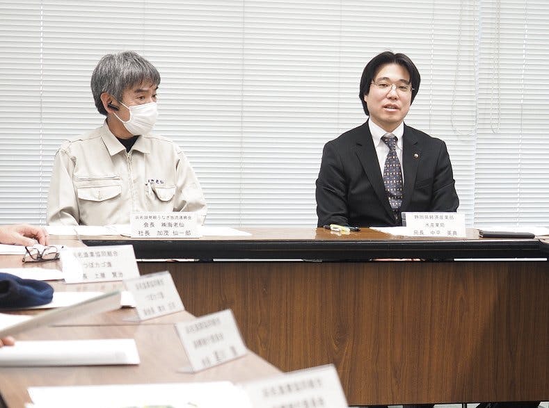 この会議には行政から静岡県・浜松市・湖西市、研究機関から静岡県水産試験場浜名湖分場、利用者から浜名湖うなぎ料理専門店振興会、産地として浜名湖養魚漁業協同組合、浜名漁協からうなぎ漁に関係する漁師さんの代表や指定仲買人などが参加して忌憚のない意見交換を行っています。問題を同じくし、うなぎの将来を力を合わせて築こうと集まった会議はさらに力を合わせて来年度へと結束しています。
