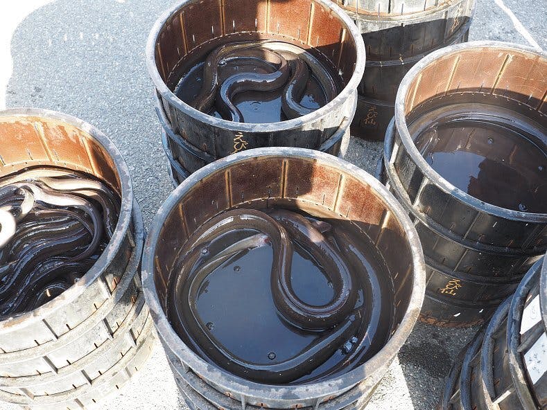 放流日の出港前に指定仲買人の海老仙から運んだのは68kgの親うなぎ、オスとメスに分けてカゴに入れて舞阪漁港に到着します。