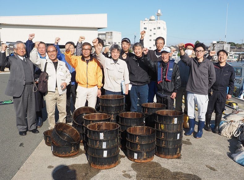 放流時間には静岡県・浜松市・湖西市、浜名湖、浜名湖発 親うなぎ放流連絡会のメンバーであるうなぎ関連のみなさん。借り上げた漁船に積み込み多くが見送る中舞阪漁港を出港し、遠州灘の沖で放流となりました。