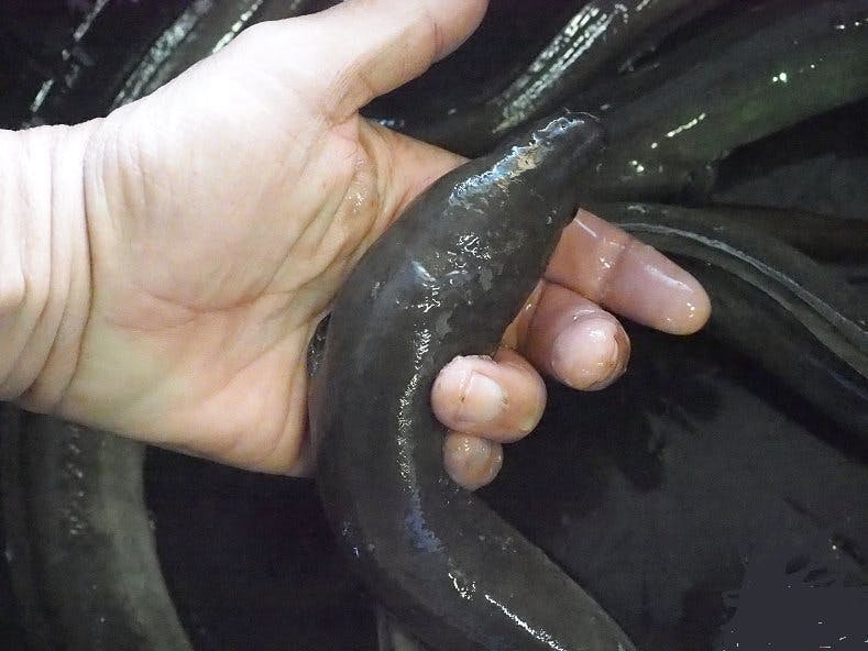 大きさの対象物がないため、手を添えてみますと親うなぎはこれほどの太さ・大きさを持ち、天然うなぎ(黄うなぎ)に比べ黒銀色をしていることがおわかりでしょうか。