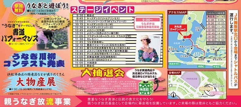 今日は年に一度の浜名湖うなぎまつりを9:30~15:30まで浜名湖ガーデンパークイベント広場周辺で開催いたします。※車でのご来場のほか、JR舞阪駅北口から会場まで無料シャトルバスを運行します
