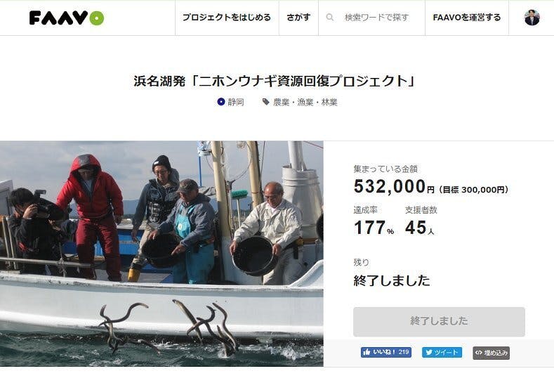 2011年より有志会で始めた親うなぎ放流事業は2013年より浜名湖発 親うなぎ放流連絡会を発足し4年、昨年度は410kgの実績となりました。今年はさらに放流量を増やしたいと静岡県・浜松市・湖西市のご協力を得てFAAVO静岡のクラウドファンディングを活用してご支援をお願いいたしました。