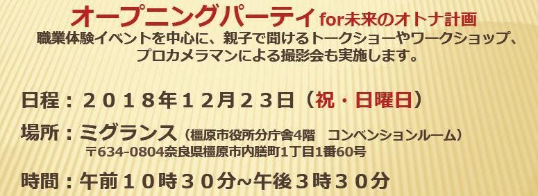 ※オープニングパーティfor未来のオトナ計画の開催場所は、ミグランス4階コンベンションルーム(橿原市分庁舎/橿原市内膳町1丁目1番60号)にて、12月23日(祝日)10時30分~15時30分の開催となります。
