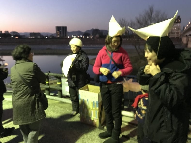 2017/12/24 18:11おかげさまをもちまして、2017年、12回目の「こよみのよぶね」が終了しました。当日は快晴にめぐまれ、風もおだやかな日となり(これが実はよぶねの運航に一番大事なことなのです)、例年に増して大勢のみなさまにご来場いただくことができました!当日の様子(早朝に集合しての準備から)は、今年の12月行灯の制作を担当してくれた「やながせ倉庫×カンダマチノート」チームの一員でもある「さかだちブックス」さんが、それはそれは素敵にまとめてくださいました。過ぎ行く1年に思いを馳せる。岐阜の冬の新風物詩、こよみのよぶね。 当日の全容はぜひ上記リンクからご覧いただくとして、こちらにはみなさまからご支援いただきました「こよみのえぼし」の様子をご紹介します!まずは、点灯式会場(鵜飼観覧船のりば)にて、スタッフによる「えぼし」配布の風景。向こうに船出を待つよぶねたちの姿が。長良川右岸プロムナードでも「えぼし」を配布。あまりの人気ぶりに、いったんお楽しみになって不要となった方からはご返却いただき、次に着用をご希望される方にお渡しする方式としました。 「こよみのよぶね」Facebookページの投稿も、ぜひ併せてご覧くださいね。それでは、また! もっと見る