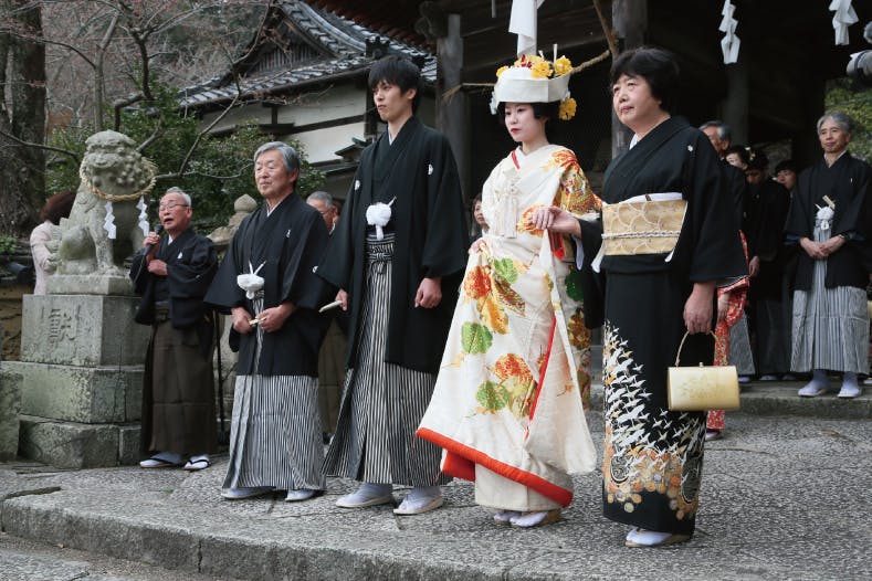 多くの人が見守る建物の前で、昔ながらの三三九度。